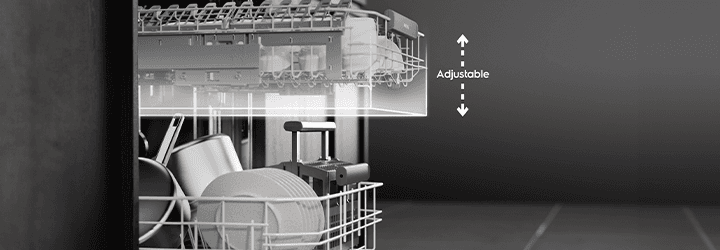 Déplacez le panier supérieur vers le haut, pour créer plus d'espace pour des assiettes et des ustensiles de cuisine plus grands, dans le panier inférieur, ou déplacez-le vers le bas pour plus d'espace dans le panier supérieur. Vous pouvez déplacer le panier même lorsqu'il est complètement chargé.